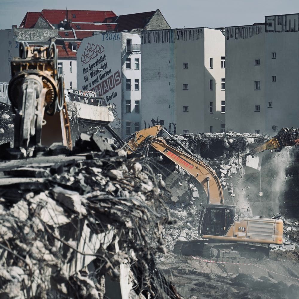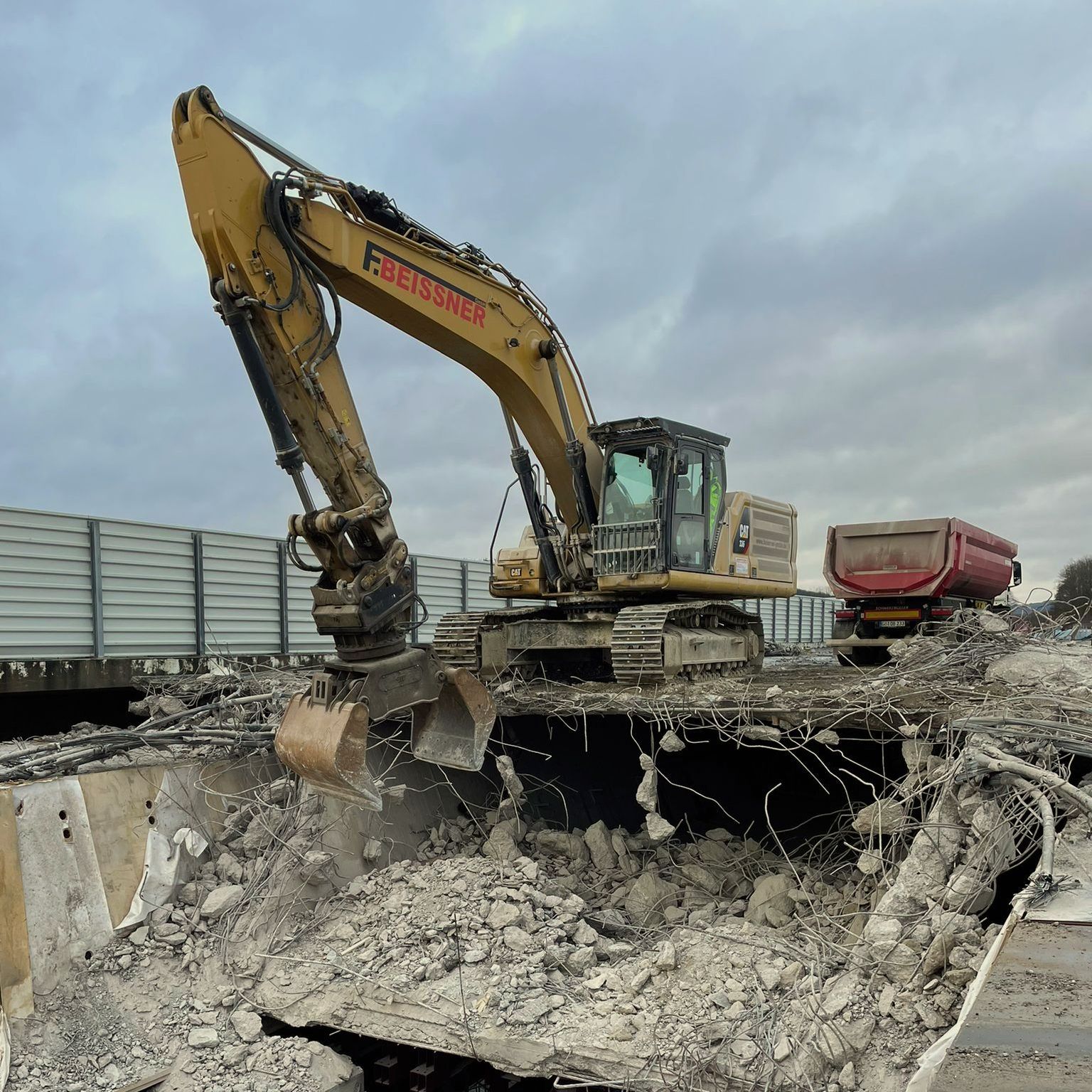 Die Ringbahnbrücke überführt die A 100 über mehrere Bahngleise. Mitte März 2025 wurde festgestellt, dass ein bereits bekannter Riss sich ungewöhnlich stark vergrößert hat. Das Bauwerk wurde umgehend gesperrt und schnell war klar, hier muss zügig gehandelt werden. Nach kurzer Ausschreibungsdauer wurden wir mit dem Abriss des Bauwerks beauftragt. Aufgrund der hohen Anzahl an Bahnschienen & dem Verlauf des Bauwerks, mussten eine Vielzahl an Stahlplatten und Baggermatratzen verlegt werden. Trotz der kurzen Zeit die zur Vorbereitung zur Verfügung stand, konnten wir, nicht mal 1,5 Wochen nach Bekanntgabe des Auftrags mit dem Rückbau anfangen. Gearbeitet wurde in Tag- und Nachtschichten, und so konnten wir nach nur 4 Tagen die Arbeiten soweit abschließen, dass der Bahnverkehr wieder rollen konnte. Somit verging nicht mal ein Monat zwischen Sperrung und Fertigstellung des Abriss.