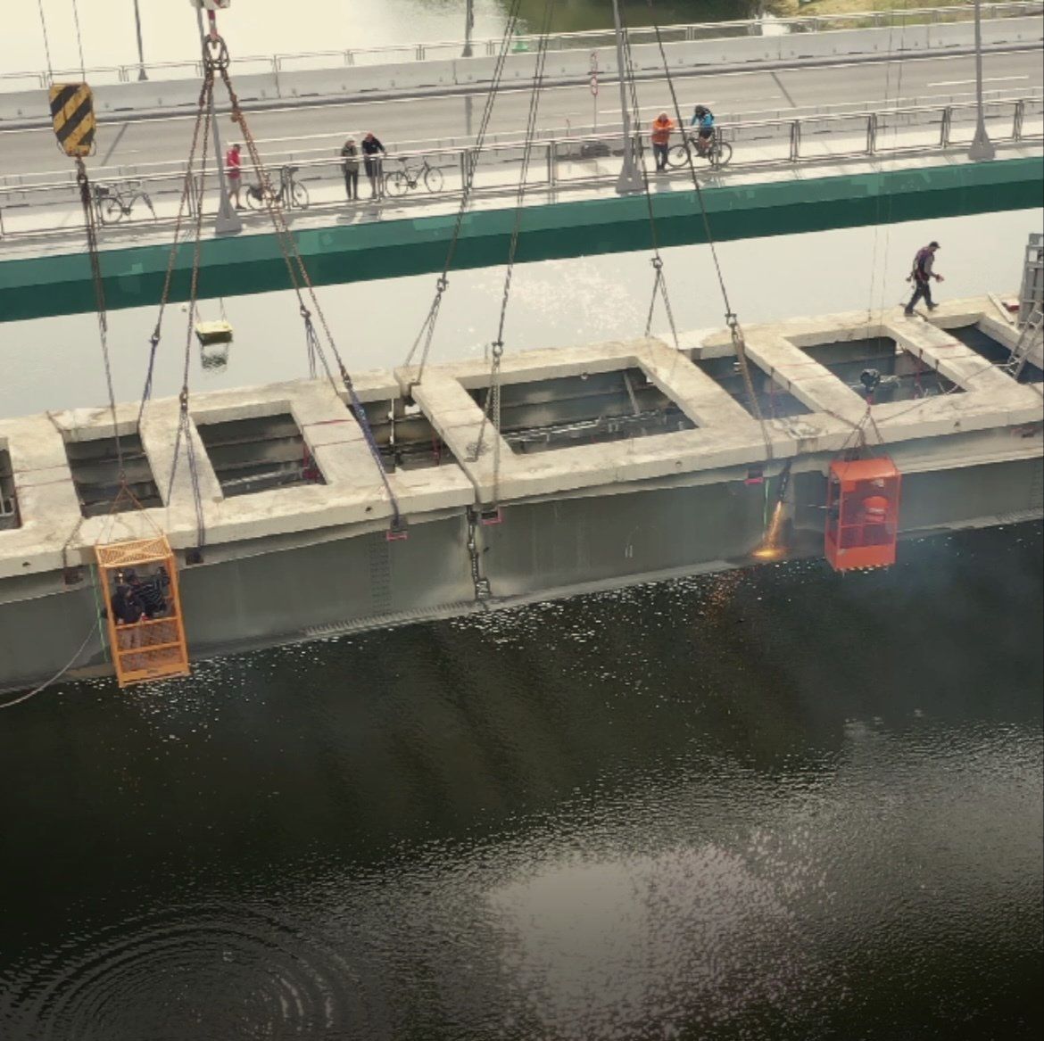 Augrund der besonderen Lage wurde bei diesem Abbruch zuerst der Fahrbahnbelag und die Betonplatten mit Hilfe einer Schneidtechnik entfernt. Anschließend wurden im Bereich über dem Main die ersten Teile der Stahlkonstruktion mit Hilfe einer Schneid- Brenntechnik von beiden Seiten her getrennt und mittels zwei 500 to. Kräne herausgehoben.