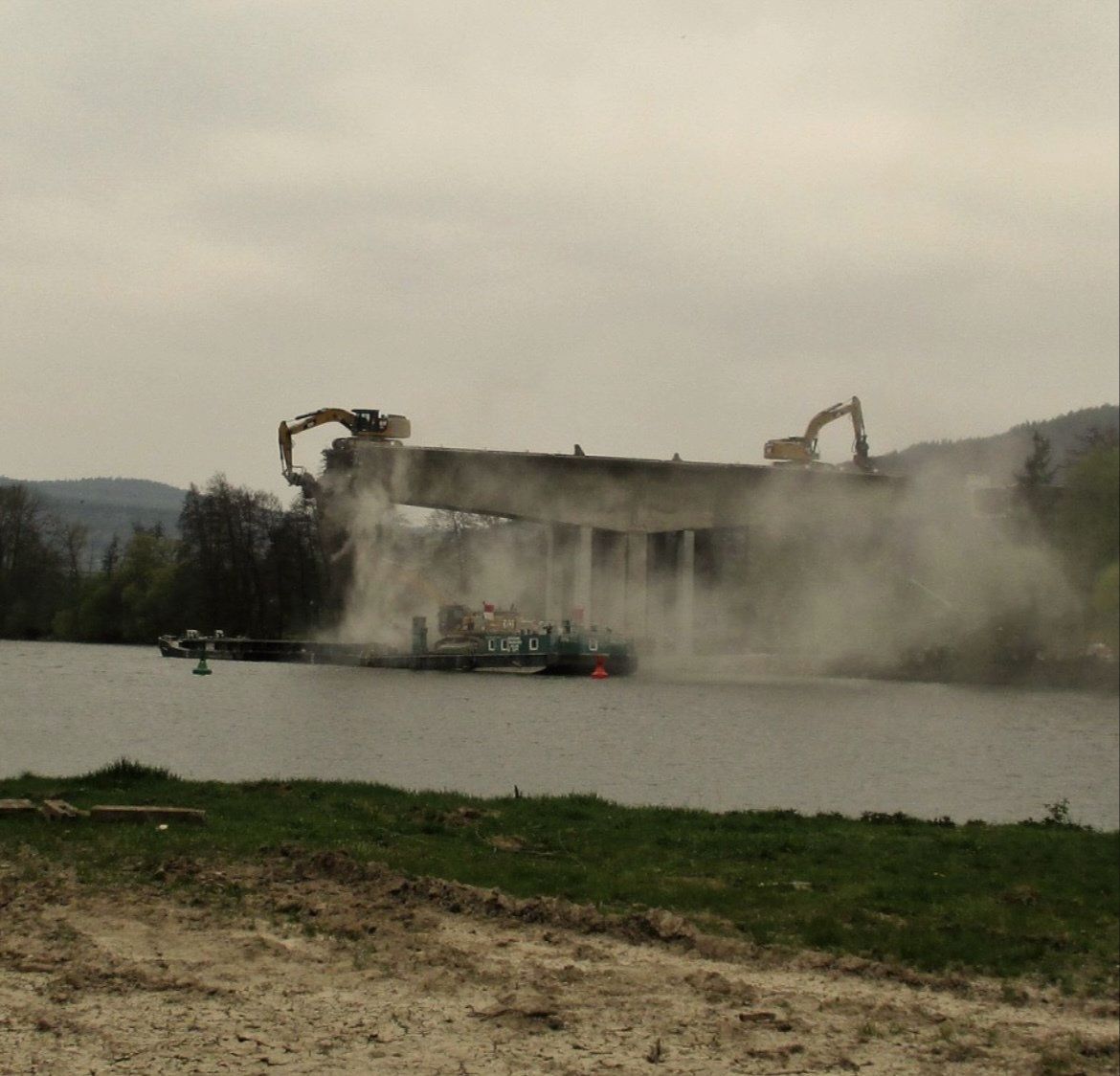 Die Sperrzeit des Mains betrug nur drei Wochen. Die Abbruchmassen der Überbaus betrugen ca. 2.300 m3, die restlichen Bauteile wurden teilweise sprengtechnisch und mit einem Lonfrontbagger abgebrochen..